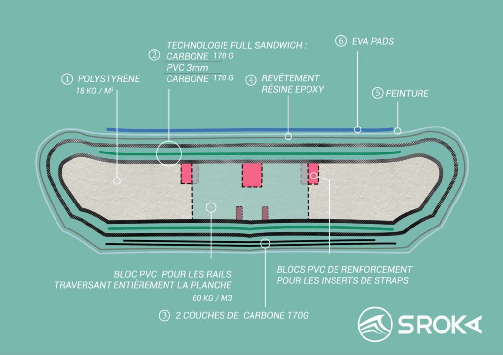 Nos Sky Rider 4’8 (67L) et 5’2 (77L) font partie des seules du marché à être intégralement faites en sandwich PVC carbone (ou sandwich PVC fibre de verre, au choix). Cet écrin renferme un pain de polystyrène hyper dense. De même, tous les points de fragilité potentiels ont été renforcés au maximum. Des inserts de straps au plug de leash, en passant par la poignée de portage, toutes ces connexions sont collées dans un bloc de PVC et renforcées pour un maximum de tenue dans le temps.
